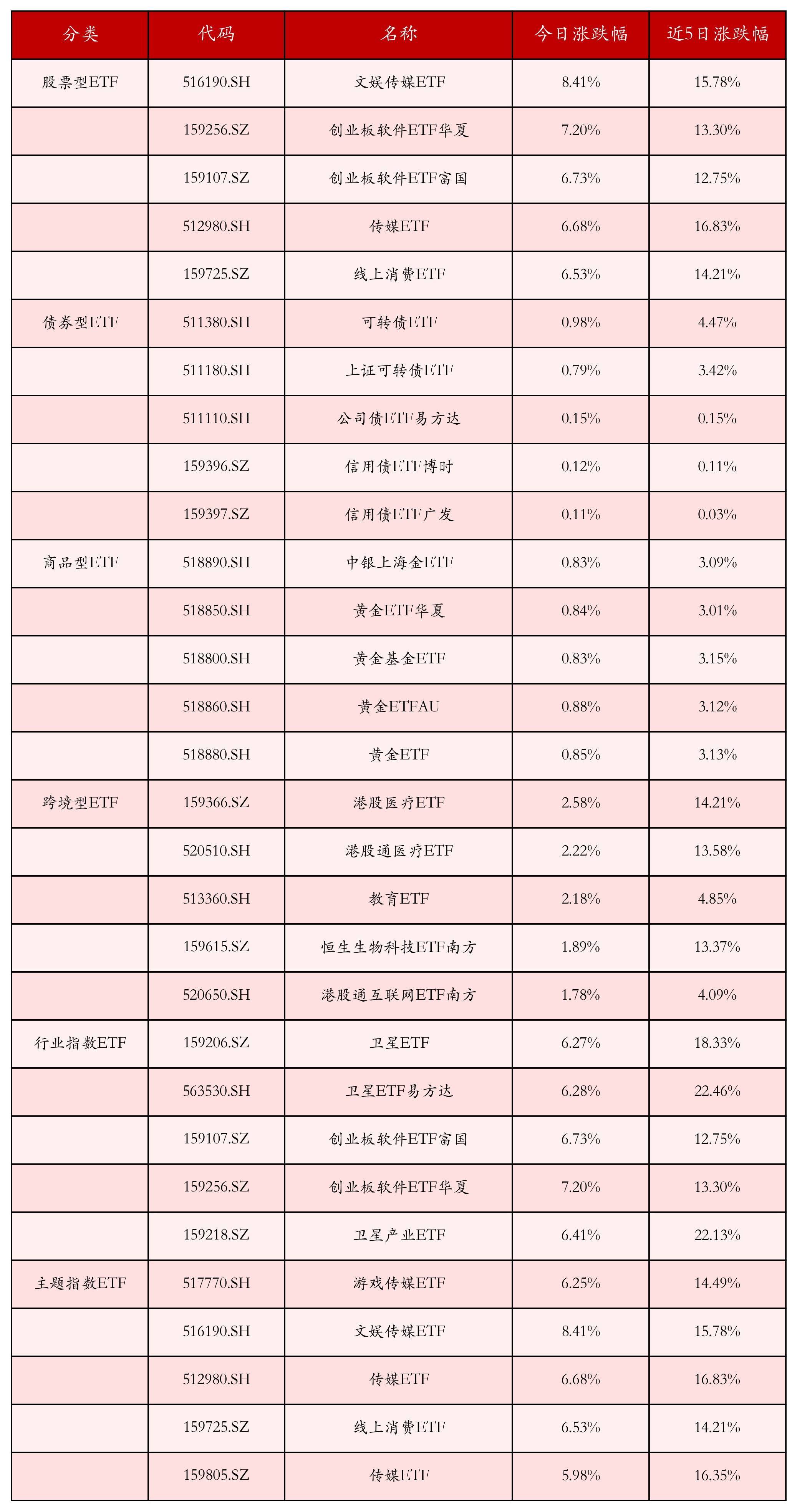 从不同投资种类、行业、主题的ETF产品中找出今日走势行情排名前5的ETF基金,今日涨幅靠前的ETF产品如下表所示。股票型ETF中涨跌幅排名前3位的ETF产品分别为文娱传媒ETF(516190.SH)、创业板软件ETF华夏(159256.SZ)和创业板软件ETF富国(159107.SZ),今日收益率分别为8.41%、7.20%和6.73%。
