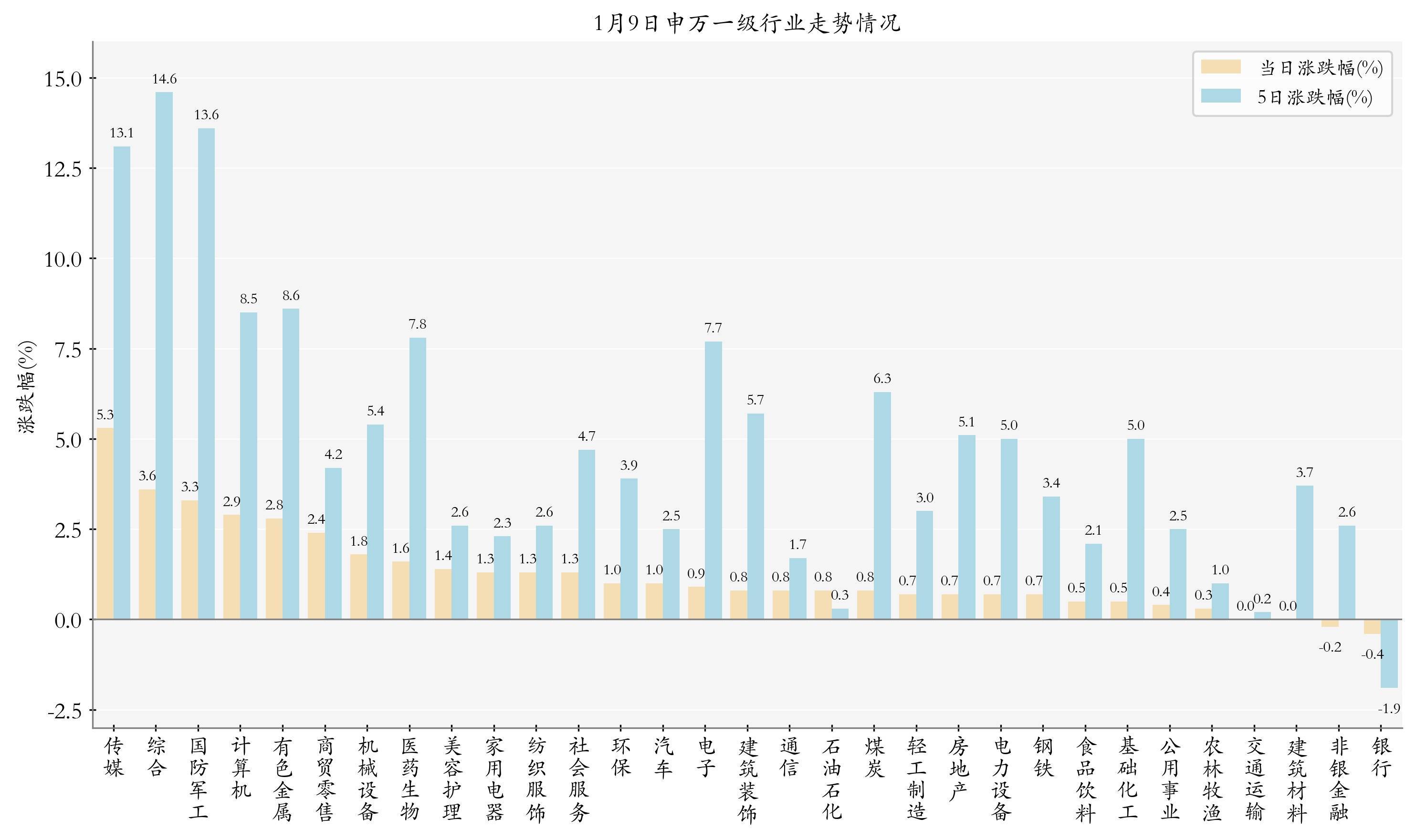 统计今日全部申万一级行业涨跌幅情况,传媒、综合与国防军工今日走势排名靠前,日涨跌幅分别为5.31%、3.6%与3.29%,银行、非银金融与建筑材料的走势排名靠后,日涨跌幅分别是-0.44%、-0.2%与0.01%;近5个交易日综合、国防军工与传媒的走势排名靠前,近5日涨跌幅分别为14.55%、13.63%与13.11%,银行、交通运输与石油石化的走势排名靠后,近5日涨跌幅分别为-1.9%、0.23%与0.29%。