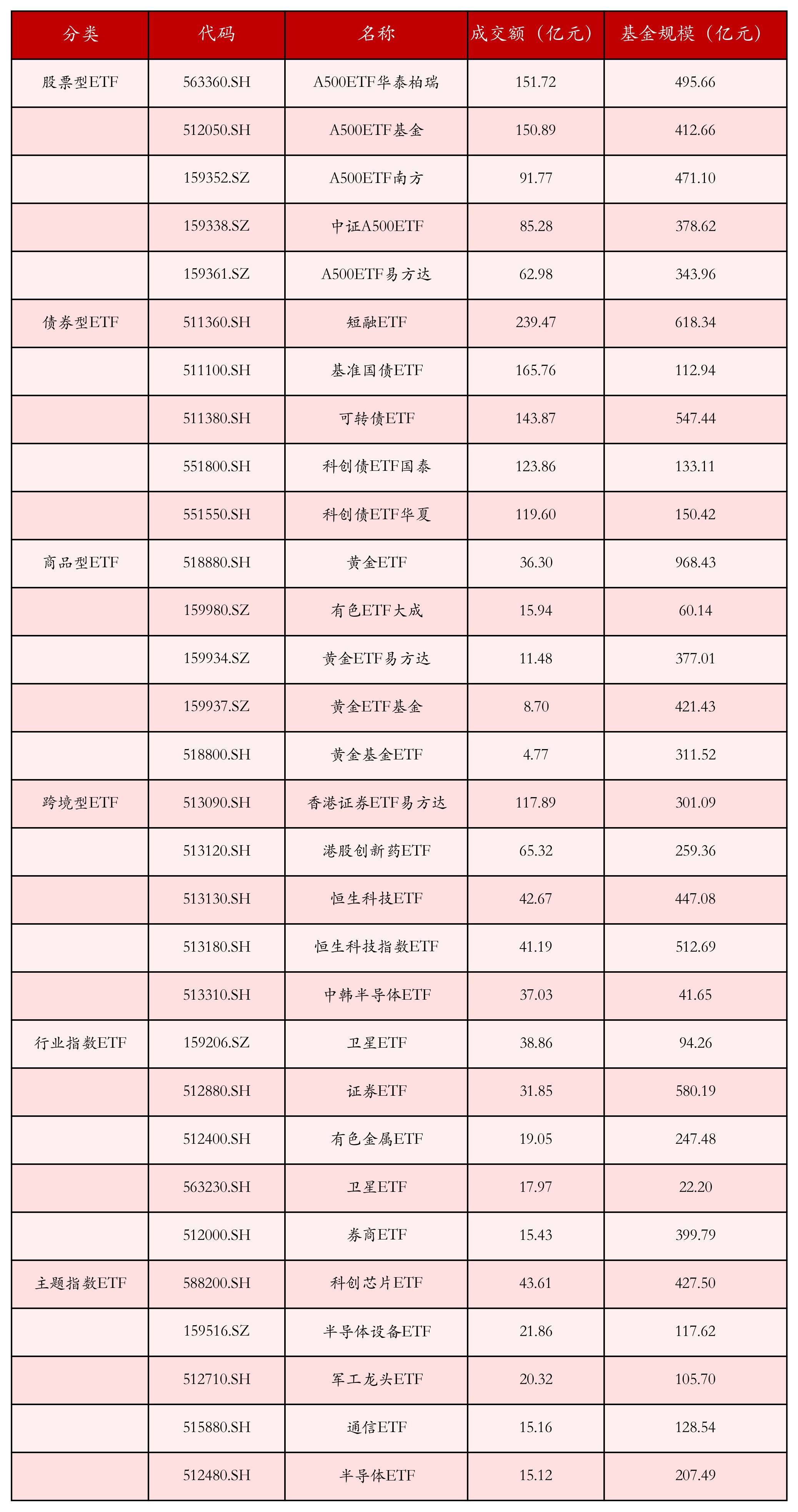 基于成交额对各类ETF今日的成交情况进行统计,成交额靠前的ETF产品如下表所示。股票型ETF中成交额排名前3位的ETF产品分别为A500ETF南方(159352.SZ)、中证A500ETF(159338.SZ)和A500ETF易方达(159361.SZ),今日成交额分别为91.77亿元、85.28亿元和62.98亿元。