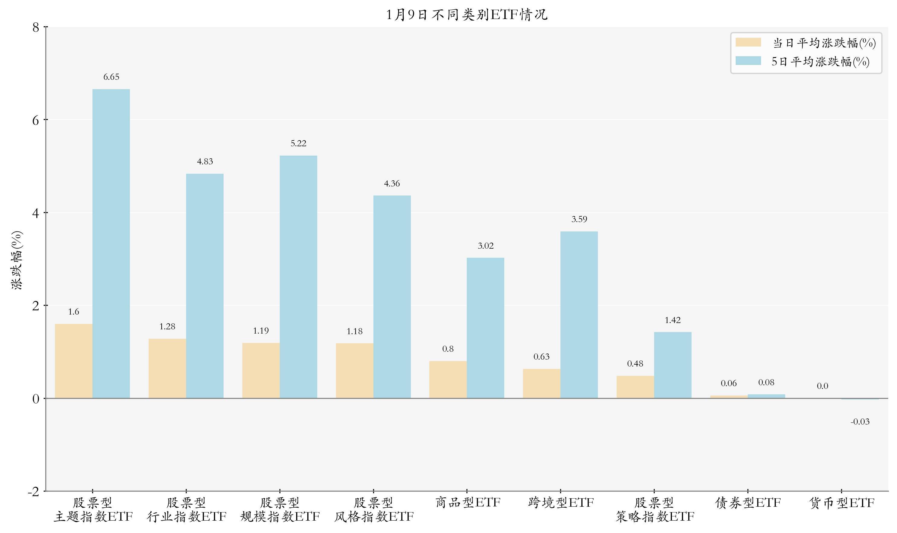 根据ETF基金的投资范围,将ETF基金划分为股票型规模指数ETF、股票型行业指数ETF、股票型策略指数ETF、股票型风格指数ETF、股票型主题指数ETF、债券型ETF、商品型ETF、货币型ETF、跨境ETF,今日股票型主题指数ETF表现最优,该类ETF的平均涨跌幅为1.60%;货币型ETF的表现最差,该类ETF的平均涨跌幅为-0.00%。